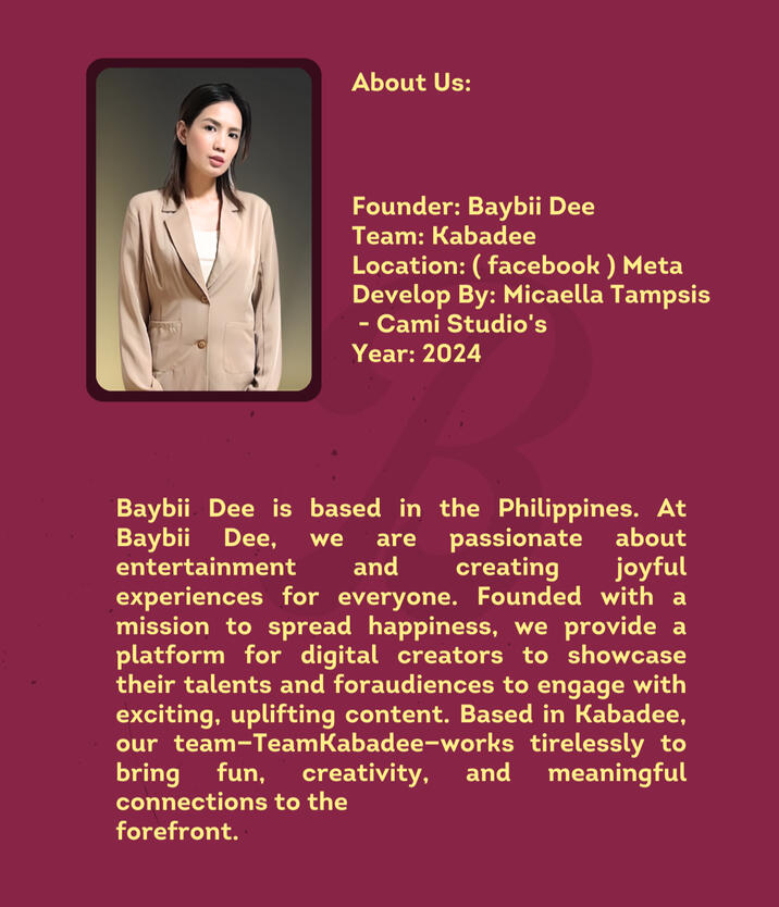 About Us content is a way for Audience to learn about Baybii Dee and create a sense of trust in our brand. Being connected with us and creating a foundation is important. We are also one of the Entertainment Agency at META.Offline Hour : Sat - Sun ( Weekend )